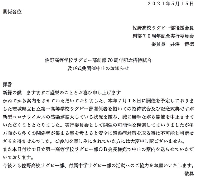 日頃より、佐野高校ラグビー部への応援と、後援会活動へのご理解とご協力を賜り、